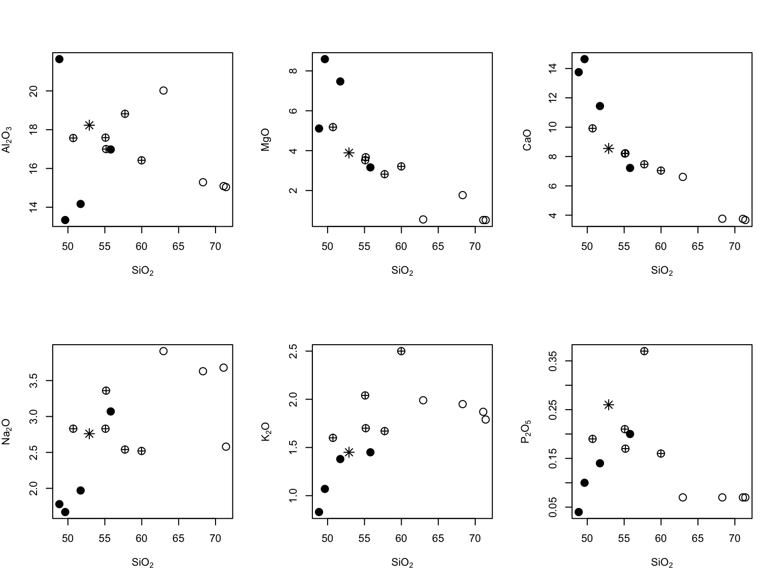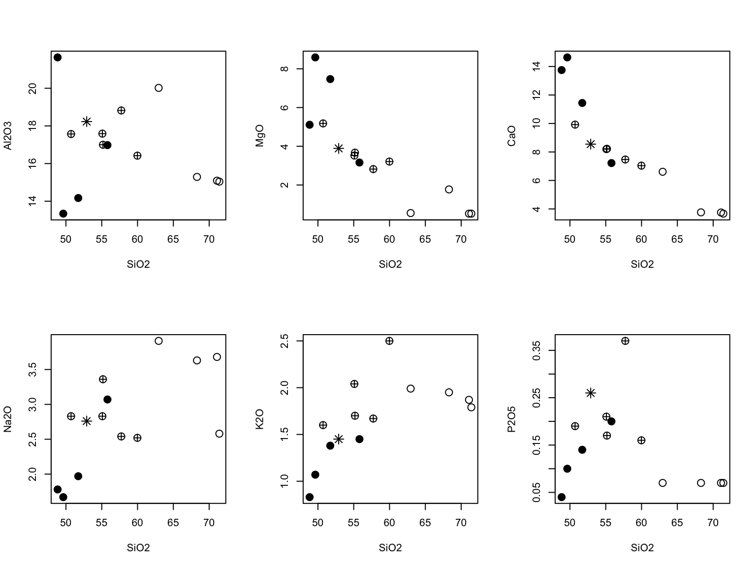 Using a loop and function par(mfrow), write a short program that would plot six binary plots of SiO\(_2\) vs. major-element oxides of your choice.