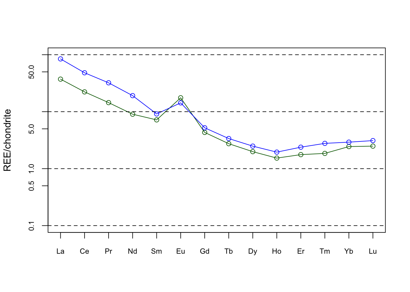 plot(y[,"Po-1"],type="o",log="y",axes=FALSE,xlab="",ylab="REE/chondrite",ylim=c(0.1,100),col="darkgreen")
